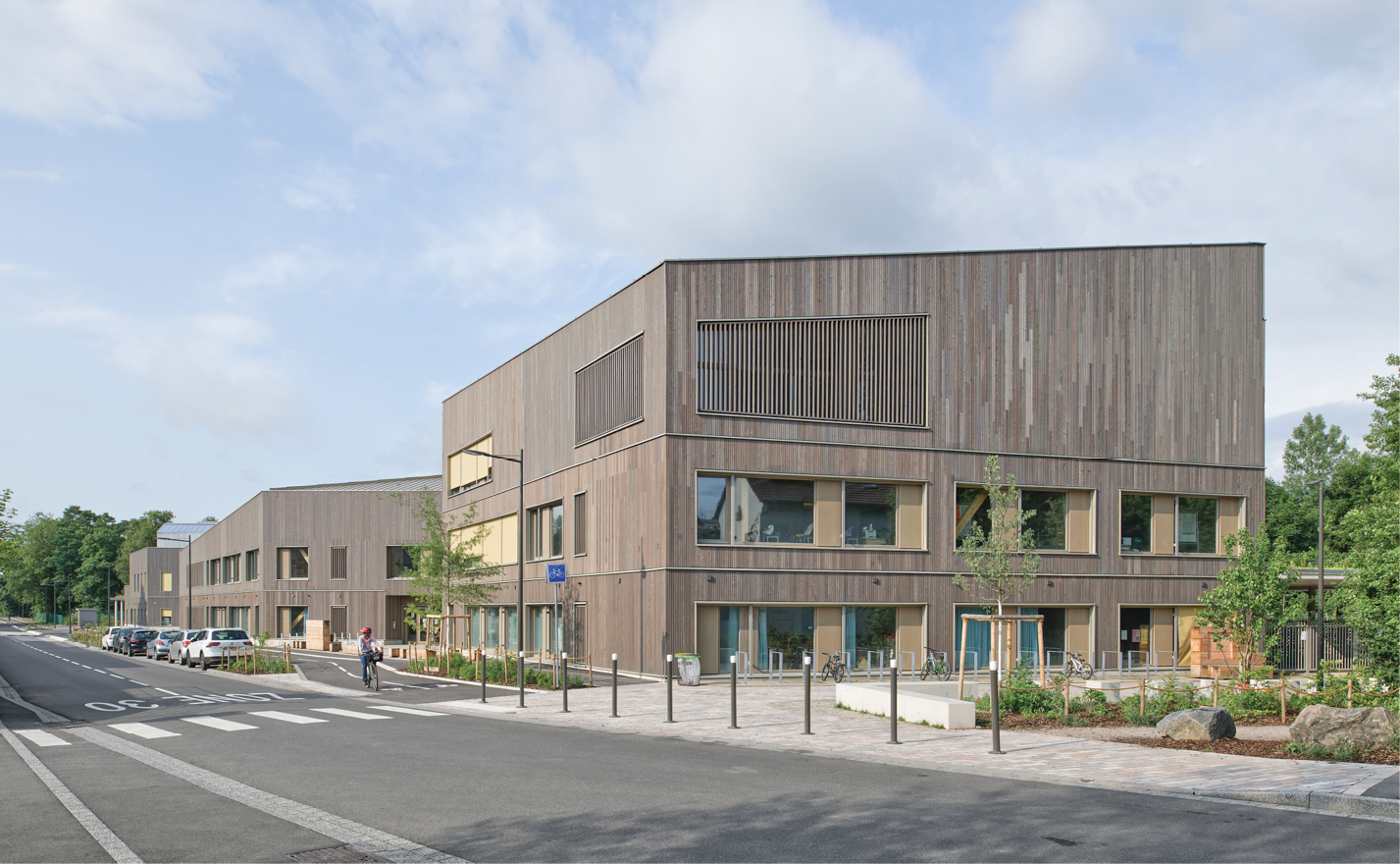 Das Grundstück liegt zwischen einem Industriegebiet im Osten und einem Naturpark im Westen. Das Holzbau-Ensemble vermittelt zwischen den landschaftlichen Kontrasten des Straßenbildes und der Uferlandschaft. Richtung Naturraum öffnet sich der Gebäudekomplex mit vielfältigen Freiräumen und begehbaren Dächern. Der Außenbereich mit zwei Höfen, Biotopen und pädagogischen Gärten ist erweiterter Lern- und Spielraum für die Kinder. Im Inneren bildet die zweigeschossige, lichtdurchflutete Bibliothek das Herzstück der Volksschule. Die räumliche Gliederung der Schule in drei Baukörper, die durch transparente Brücken verbunden sind, führt zu einer klaren Orientierung und ermöglicht Sichtbeziehungen und Durchgänge zur Natur. Das Gebäude ist auf die Bedürfnisse von Kindern zugeschnitten.