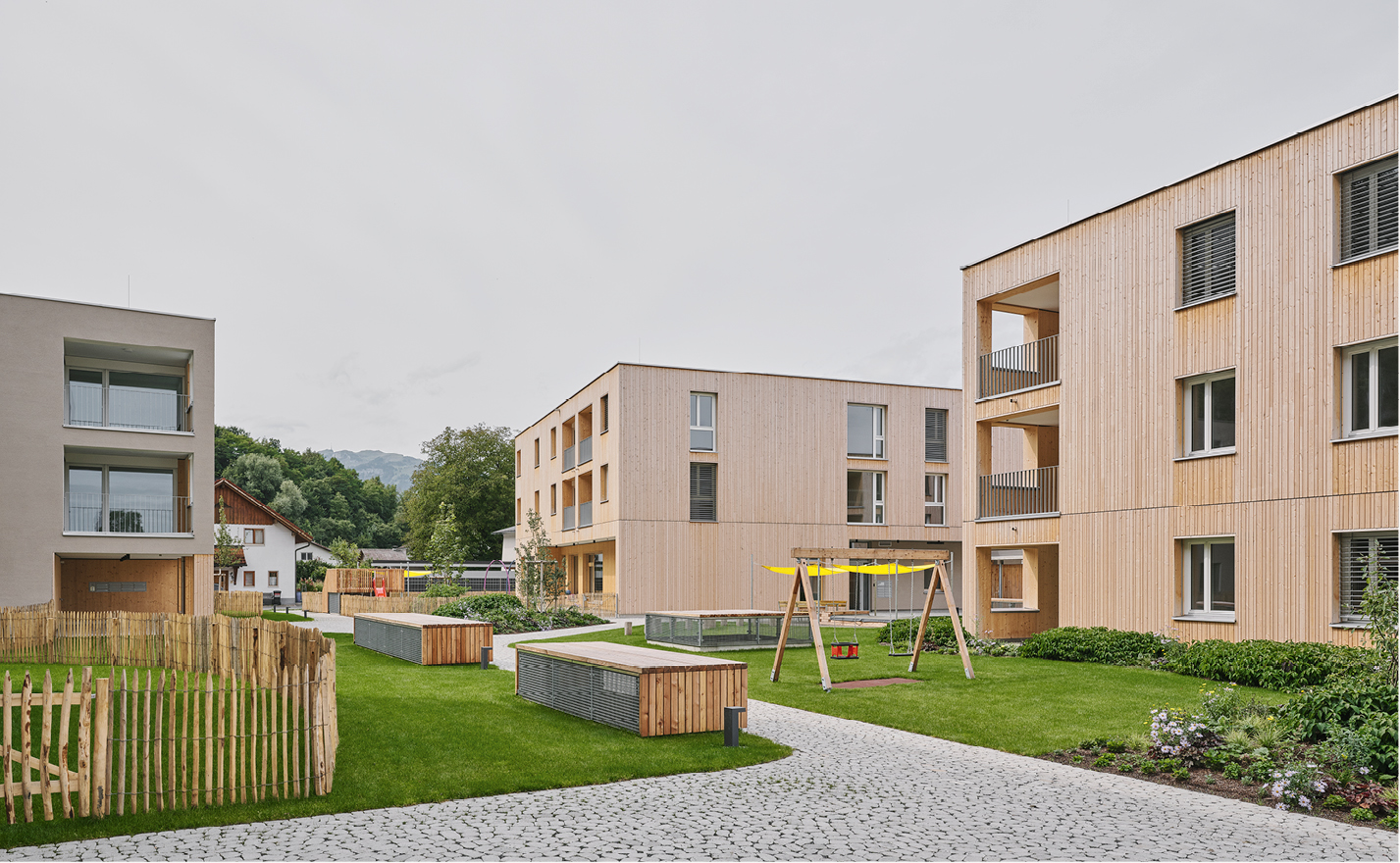Entlang der Hauptstraße in Koblach entsteht eine neue Wohnsiedlung. Ein Vorplatz, das „Kutzner Plätzle“, bildet den Auftakt zur autofreien Anlage. Als lebendiges Zentrum des Quartiers fungiert er als Schnittstelle zwischen öffentlichem und privatem Raum. Vor dem Platz befinden sich Gemeinschaftsräume, und auch die Kindertagesstätte wird von hier aus erschlossen. Klare, kompakte Gebäudeformen ermöglichen großzügige Freiflächen, die Anordnung der Gebäude schafft Zwischenräume mit fließenden Übergängen und Pufferzonen vor den Hauseingängen. Der angrenzende Wald mit Radweg und Naturspielflächen bildet ein harmonisches Ensemble mit der grünen Mitte. Die fünf Gebäude sind in Hybridbauweise errichtet, die Außenwände von zwei Gebäuden aus vorgefertigten Holzelementen mit Holzverkleidung und die Außenwände der übrigen drei Gebäude aus traditionell verputztem monolithischem Ziegelmauerwerk.