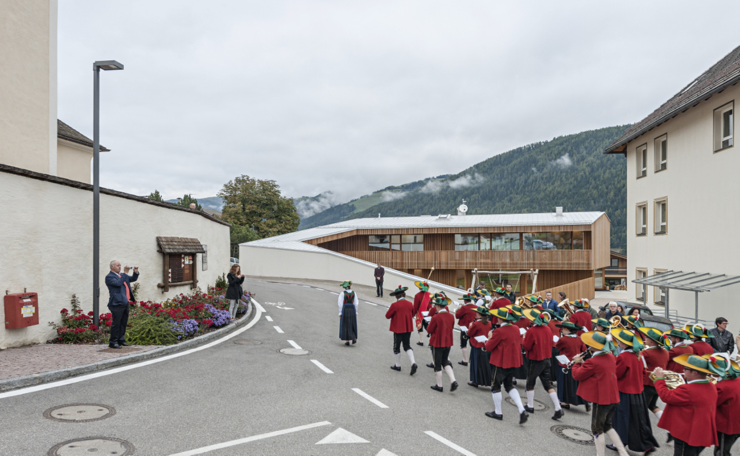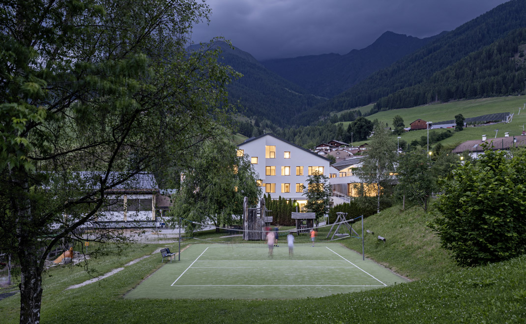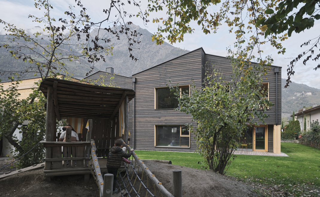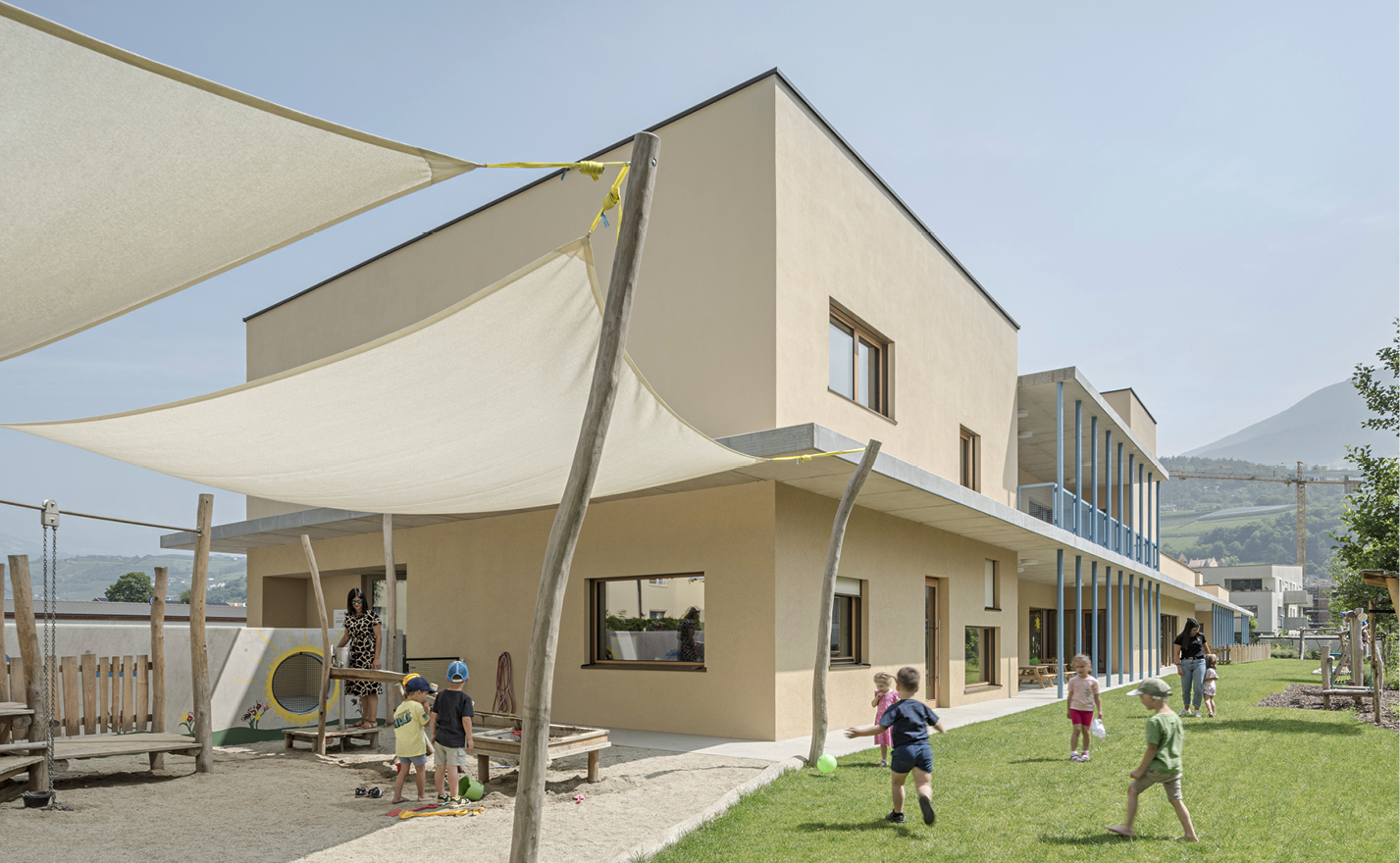 Das Bauen in den Alpen war stets von einer Suche nach dem Elementaren, dem Einfachen und nach dem klugen Umgang mit der Topografie geprägt. Der Kindergarten wurde in den Hang eingebettet und ist einerseits ein Gebäude, aber andererseits auch ein integraler Bestandteil der umgebenden Landschaft. Der Neubau entstand aus einer Rücksichtnahme auf den dörflichen Maßstab wie auch auf die Perspektive der Kleinsten. Im Inneren fördern vielfältige Raumabfolgen die Eigenaktivität, die Orientierung, die Kommunikation, aber auch das soziale Zusammenleben und ästhetisches Empfinden der Kinder. Ganz im Sinne von: der Raum ist der dritte Pädagoge.
