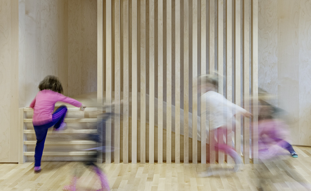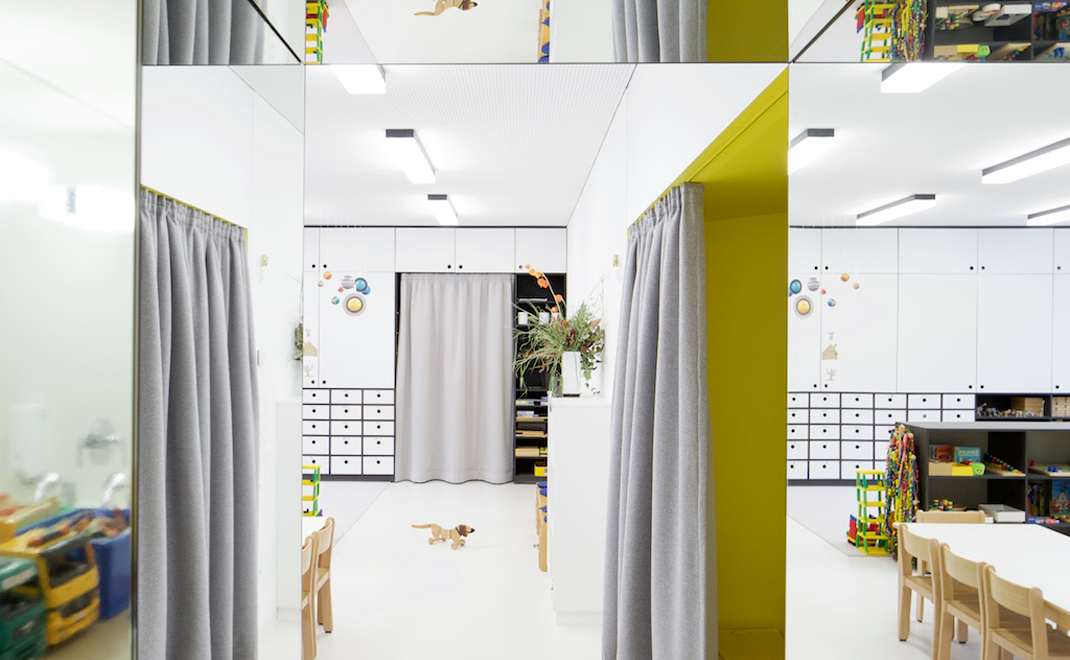 Die adaptierten Räumlichkeiten werden mit Einbauten erweitert, die unterschiedlich bespielt werden können und so die Kleinsten zu einer neuen differenzierten Raumwahrnehmung führen. Die Garderobe wird zum Theater, ein Loch in der Wand – Rutsche und Guckloch in die Gruppe, der Abstellraum wird zur Lesehöhle. Der Gruppenraum wird zu einer abwechslungsreichen Landschaft mit ruhigen und lauten Bereichen.