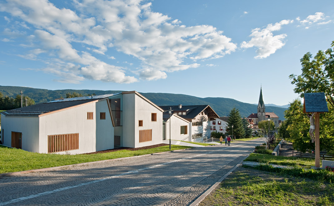 Ein zweigeschoßiges Gebäude mit Satteldächern und ein Baukörper mit Flachdach schließen im nordöstlichen Teil des Grundstückes an das Bestandsgebäude an, das 1976 von Architekt Gutweniger Willy entworfen wurde. Der Zubau strickt den Dialog zwischen Flach- und Schrägdächern eigenständig weiter. Von Beginn an stand eine ganzheitliche ökologische Bauweise im Zentrum. Der Zubau wurde als leimfreier Massivholzbau mit Holzfassade und begrünten Dächern realisiert. Die massiven Holzwände schaffen durch ihre Masse und Beschaffenheit ein angenehmes Raumklima. Ein weiteres Anliegen war die räumliche Integration der deutschen und italienischen Gruppen über die gemeinsame offene Lernlandschaft. Der sensibel reagierende Zubau legt sein Hauptaugenmerk auf diese Begegnungszonen.