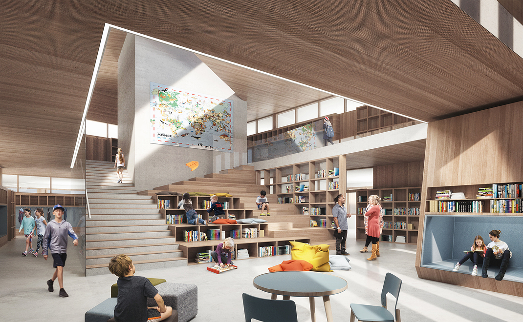 Das Grundstück liegt zwischen einem Industriegebiet im Osten und einem Naturpark im Westen. Das Holzbau-Ensemble vermittelt zwischen den landschaftlichen Kontrasten des Straßenbildes und der Uferlandschaft. Richtung Naturraum öffnet sich der Gebäudekomplex mit vielfältigen Freiräumen und begehbaren Dächern. Der Außenbereich mit zwei Höfen, Biotopen und pädagogischen Gärten ist erweiterter Lern- und Spielraum für die Kinder. Im Inneren bildet die zweigeschossige, lichtdurchflutete Bibliothek das Herzstück der Volksschule. Die räumliche Gliederung der Schule in drei Baukörper, die durch transparente Brücken verbunden sind, führt zu einer klaren Orientierung und ermöglicht Sichtbeziehungen und Durchgänge zur Natur. Das Gebäude ist auf die Bedürfnisse von Kindern zugeschnitten.