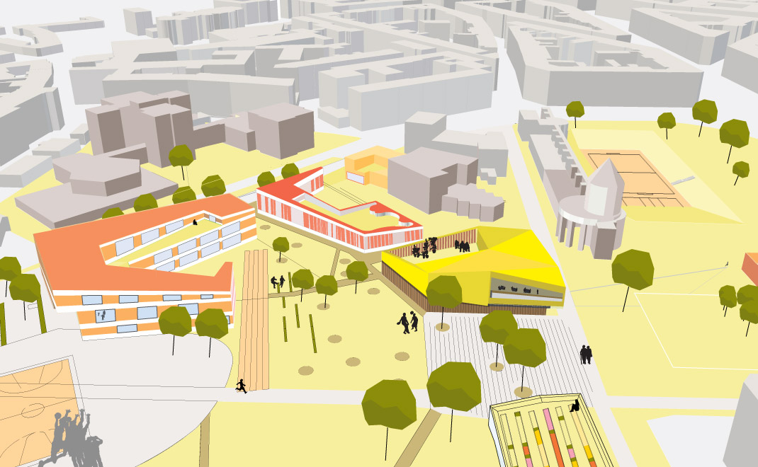 Ausgehend vom Grundgedanken die Schule als Lernort in das Bewusstsein der Bürger*innen zu verankern, stellt sich die Frage, ob dies architektonisch zwangsläufig über ein Gebäude (oder eine zusammenhängende Gebäudestruktur) oder aber über ein städtebauliches Beziehungsgeflecht mehrerer Gebäude im urbanen Kontext zu lösen ist. Wir glauben, dass durch das Weiterstricken bestehender städtebaulicher Muster die Schule auf ungezwungene Art und Weise Teil des Quartiers werden kann. Ziel ist es Möglichkeitsräume zu schaffen, die auf die dynamischen Entwicklungen der heutigen Gesellschaft reagieren können. Eine Verzahnung der Schule mit der Stadt bedeutet immer auch eine Öffnung und eine Bereitschaft auf Veränderungen zu reagieren. Dabei ist das Maß an Öffentlichkeit und Privatheit und dessen Steuerbarkeit von großer Bedeutung.